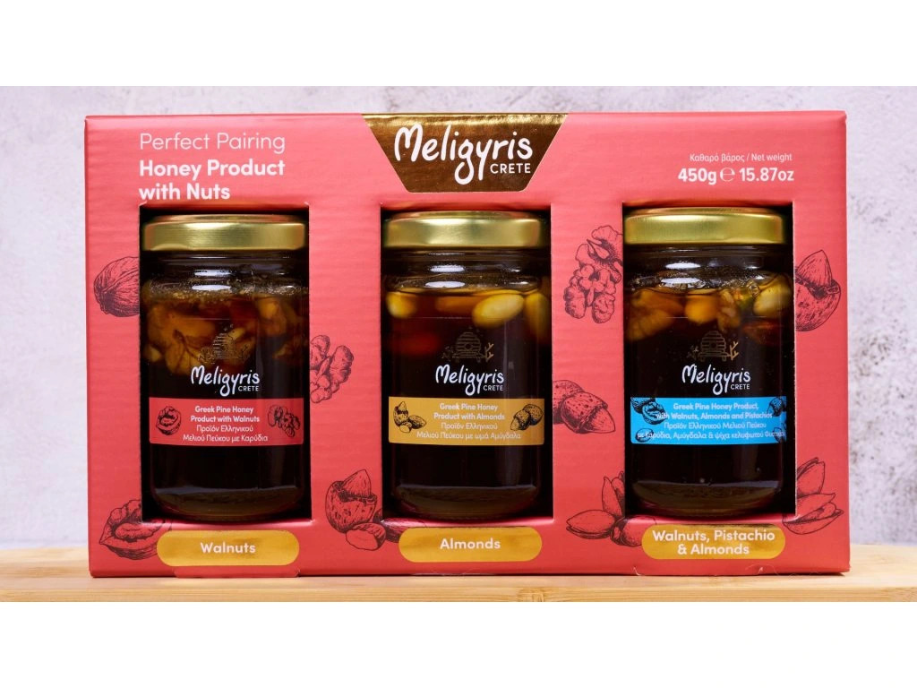 Dárková sada tří skleniček krétského borovicového medu s ořechy (mandle, vlašské ořechy, směs vlašské ořechy–mandle–pistácie). Perfektní kombinace přírodního medu z řeckých borových lesů a křupavých ořechů – jako luxusní snídaně, dezert i originální jedlý dárek.