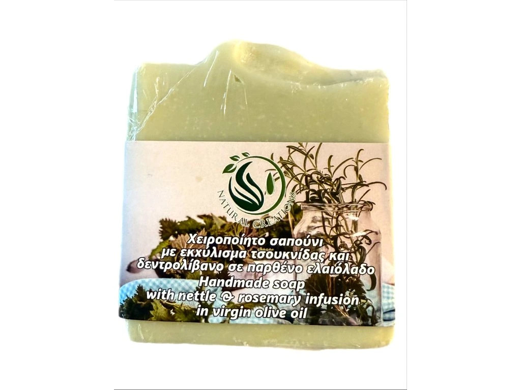 Ručně vyráběné mýdlo z čistého olivového oleje s extrakty z kopřivy a rozmarýnu. Vyrobeno metodou zmýdelnění za studena a ručně broušeno. Ideální pro suchou pokožku a vypadávání vlasů. Kopřiva vyživuje vlasy a pokožku hlavy, je tonikem, bojuje proti lupům a tato vlastnost je podpořena rozmarýnem. Kopřiva stimuluje vlasové kořínky, zlepšuje pokožku hlavy, předchází a léčí plísňové infekce, má stahující a tonizující účinky na pokožku. Rozmarýn má čistící, antioxidační, stahující, regenerační a hojivý účinek. Stimuluje růst vlasů a zabraňuje jejich vypadávání. Antimikrobiální a antibakteriální mýdlo vhodné pro obličej, tělo a vlasy.